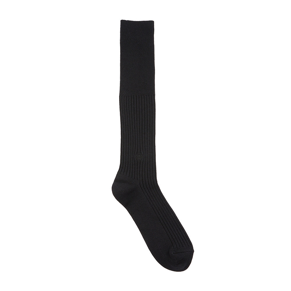 アクアスキュータムの刺繍を入れたリブハイソックスです。しっかりした肉感を出すために表糸に綿100%の30番単糸を4本どりした贅沢な商品です。