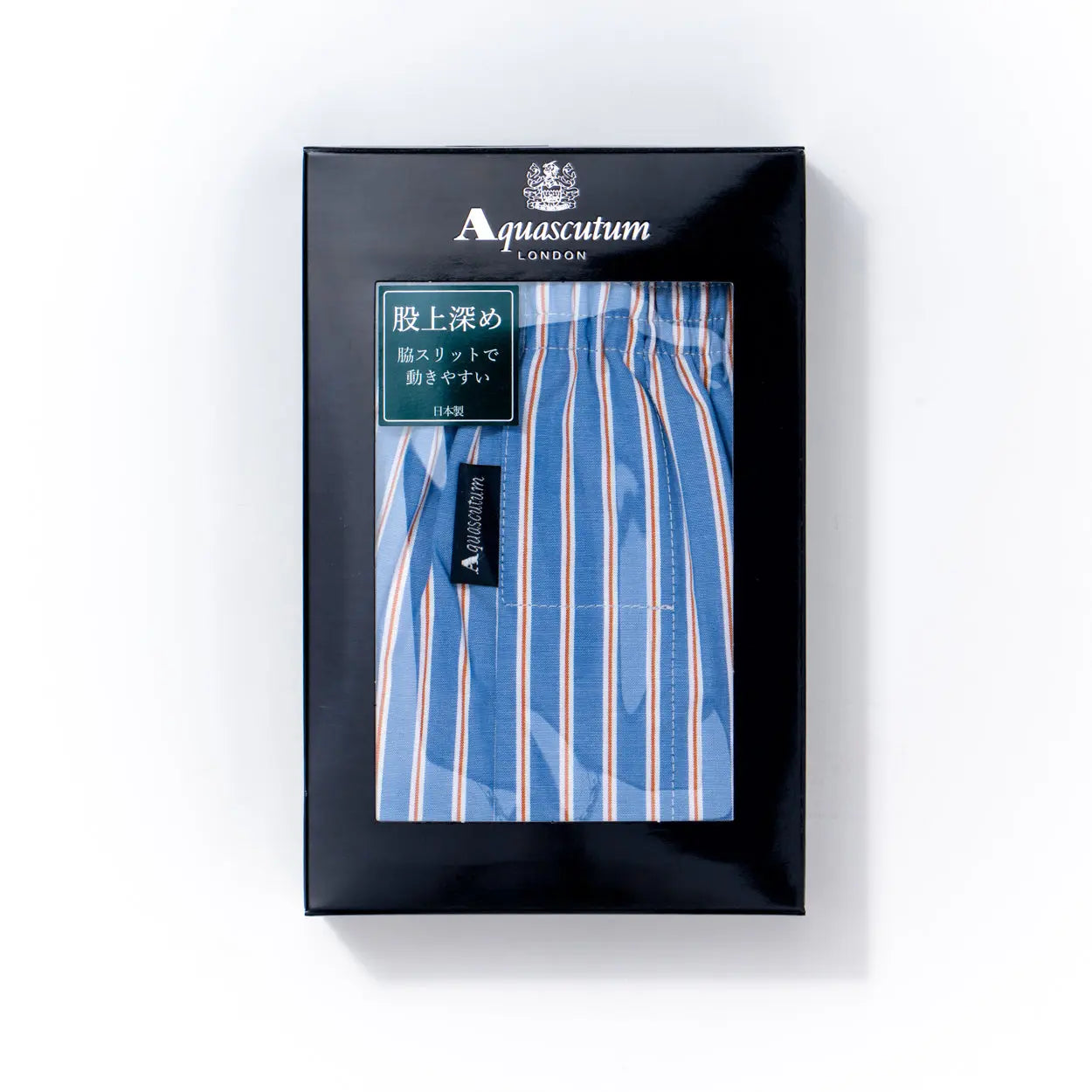 英国伝統のエレガンスを感じさせるアクアスキュータムのトランクス。両脇にはスリット入りで、動きやすく快適な履き心地を実現。ウエストはソフトな裏打ちゴム仕様のため、締め付け感が少なく、長時間の着用でもリラックスしてお過ごしいただけます。柔らかなライトブルーをベースに、ホワイトと淡いピンクのストライプを組み合わせた爽やかで優しい印象のデザイン。明るく軽やかな配色が魅力で、見た目にも着用感にも清潔感を与えてくれる一枚です。安心の日本製で、縫製や仕立ての良さも魅力。デイリー使いはもちろん、ギフトにもおすすめの一枚です。
