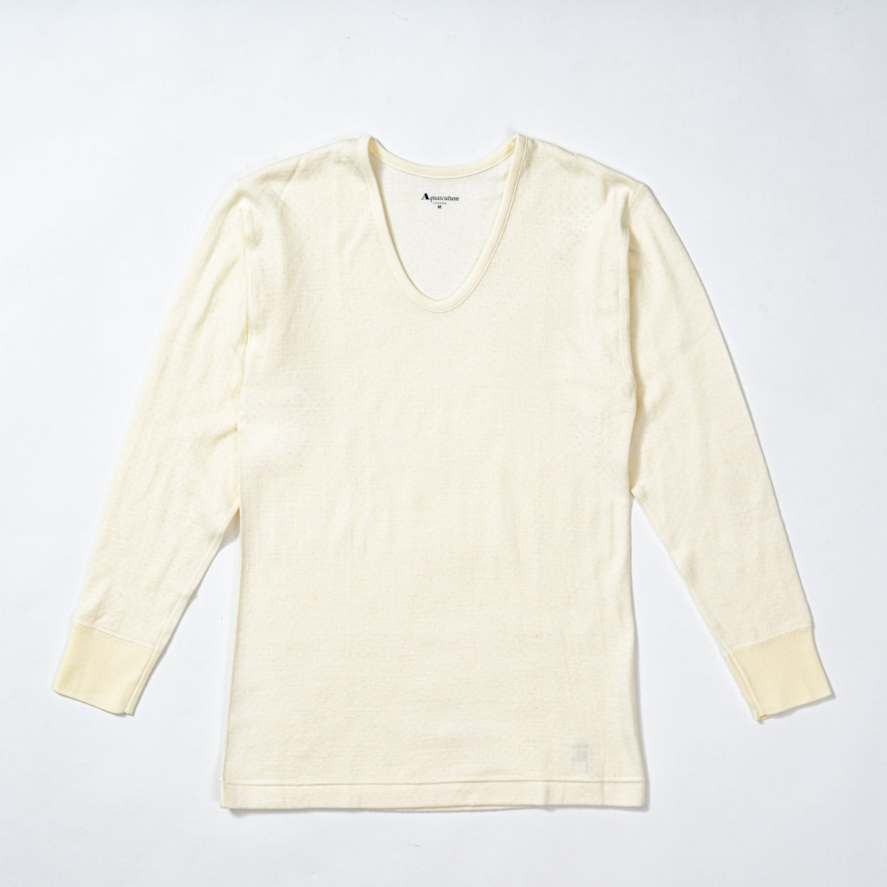 汗ばむ季節になると、思い出すのがアクアスキュータムの和紙シリーズ。化繊系の涼感肌着とは違い、天然素材ならではの爽やかな着心地があります。和紙を繊維にした特殊な糸が生地にハリとコシを与え、肌との間に風が通るような通気性を感じられます。肌離れも良く、この独特の快適さは、ぜひ一度試して実感してほしいです。
